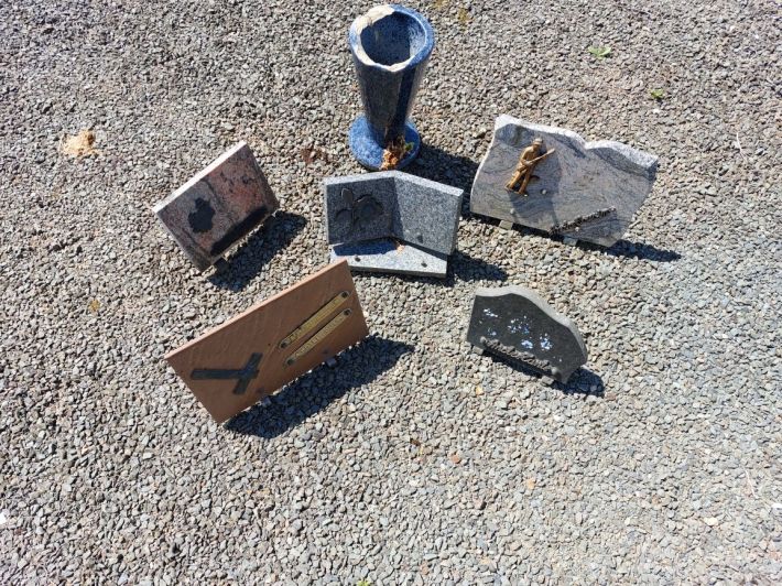 Voici les photos des plaques enlevés des tombes et mises au rebut dans le casier réservé à cet effet au cimetière. Nous supposons qu’il s’agit d’un acte de malveillance.