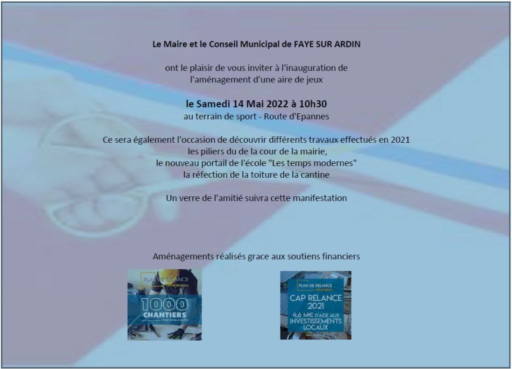 Samedi 14 mai, la commune de Faye sur Ardin a procédé à l’inauguration de l’aire de jeux aménagée au terrain de sport en présence de Mr le Député Guillaume Chiche, Mme la Présidente du conseil départemental des Deux-Sèvres Coralie Dénoues, Mr le conseiller départemental Autize Egray, René Bauruel, Mme le Maire Corine Micou ainsi que le conseil municipal et le conseil municipal des jeunes.