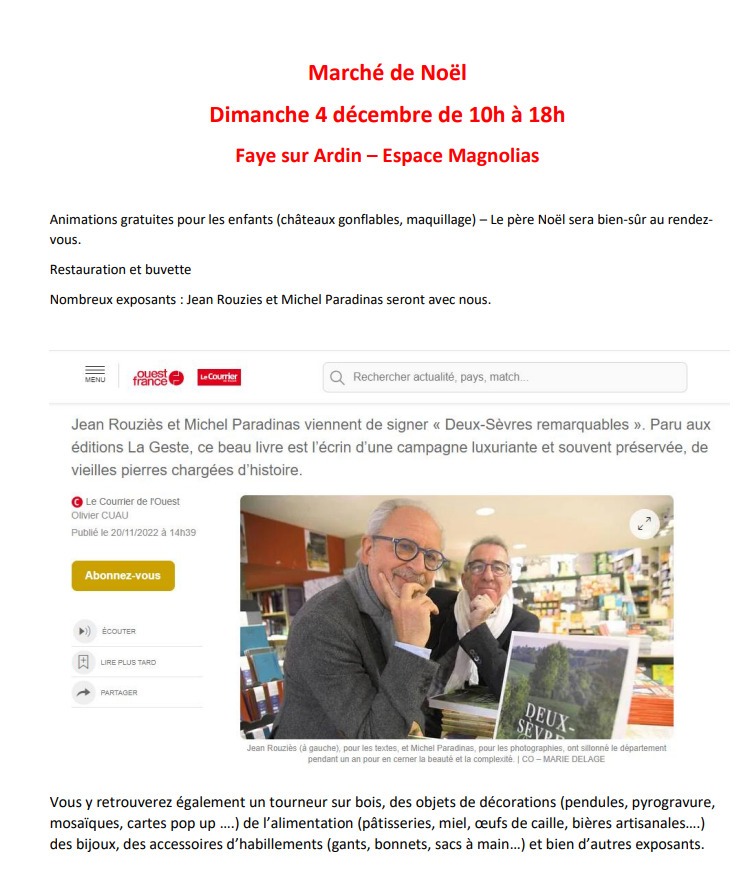 Le comité des fêtes organise un marché de noël le dimanche 3 décembre de 10h à 18h. la présence de nombreux exposants dont des nouveautés vous aideront à combler vos proches pour la fin de l’année. Pour participer, adresser un mail à comitefayesurardin@orange.fr