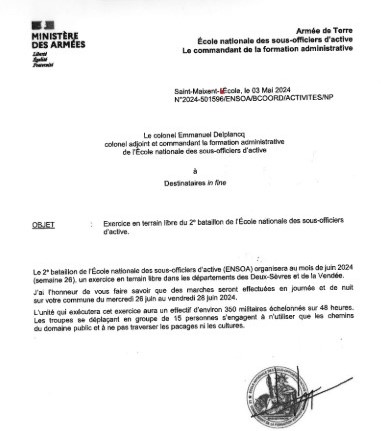 Le 2ème bataillon de l’ENSOA organise un exercice en terrain libre. Des marches seront organisées sur notre commune du mercredi 26 au vendredi 28 juin de jour comme de nuit.